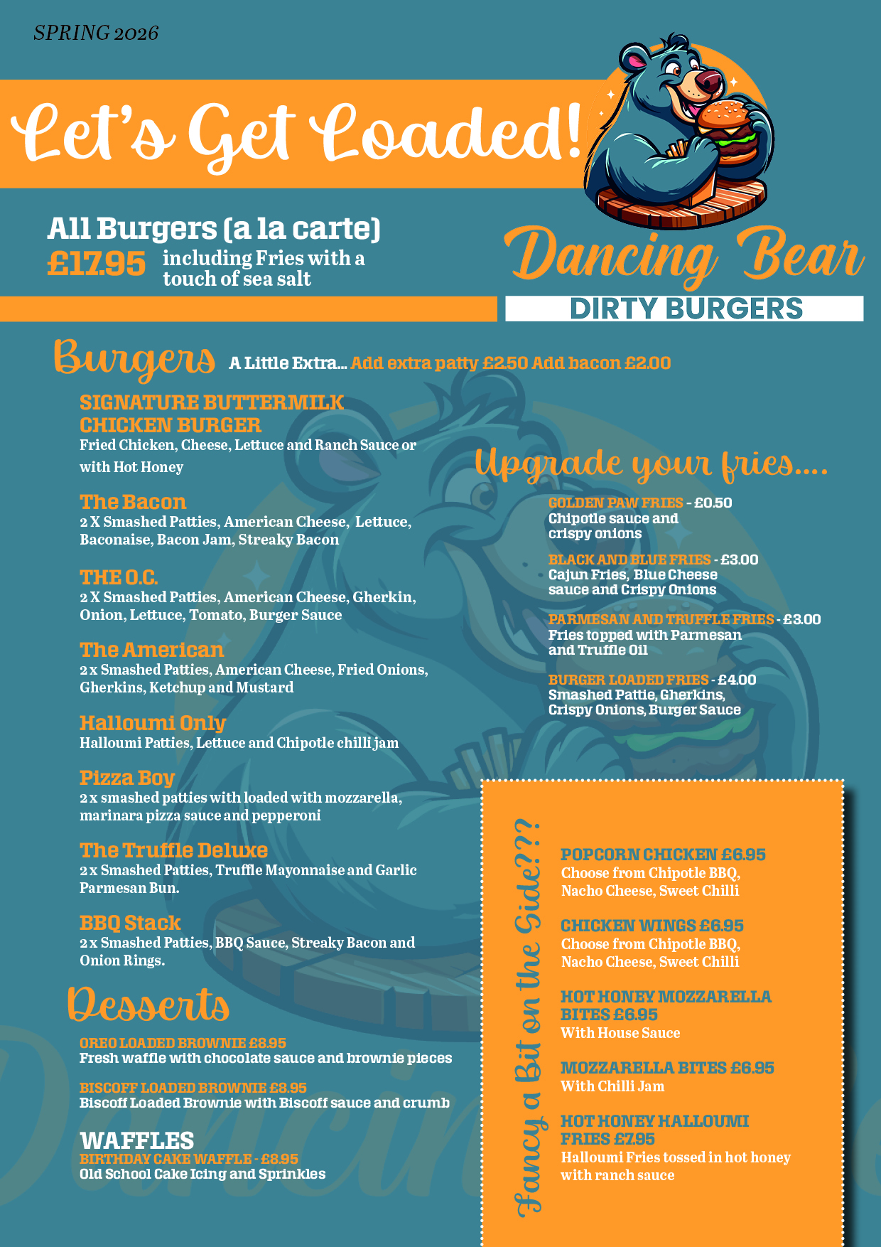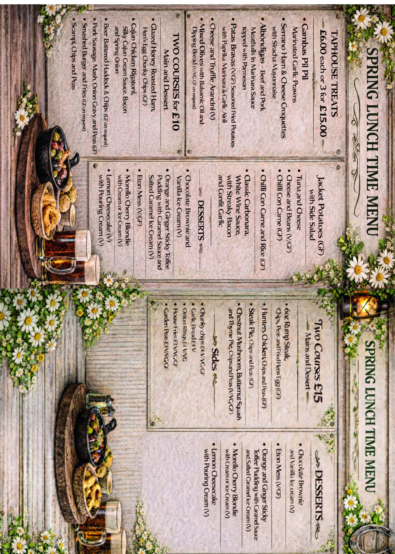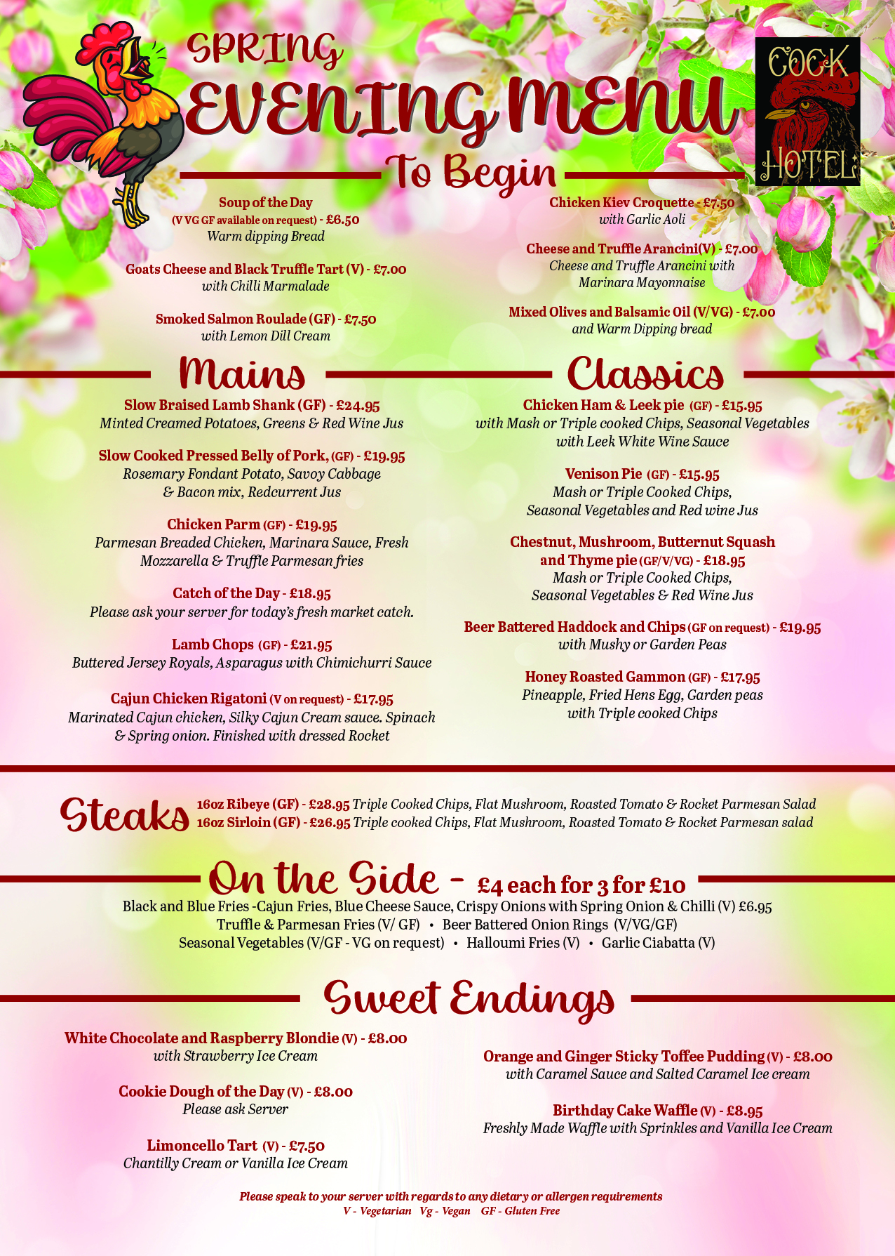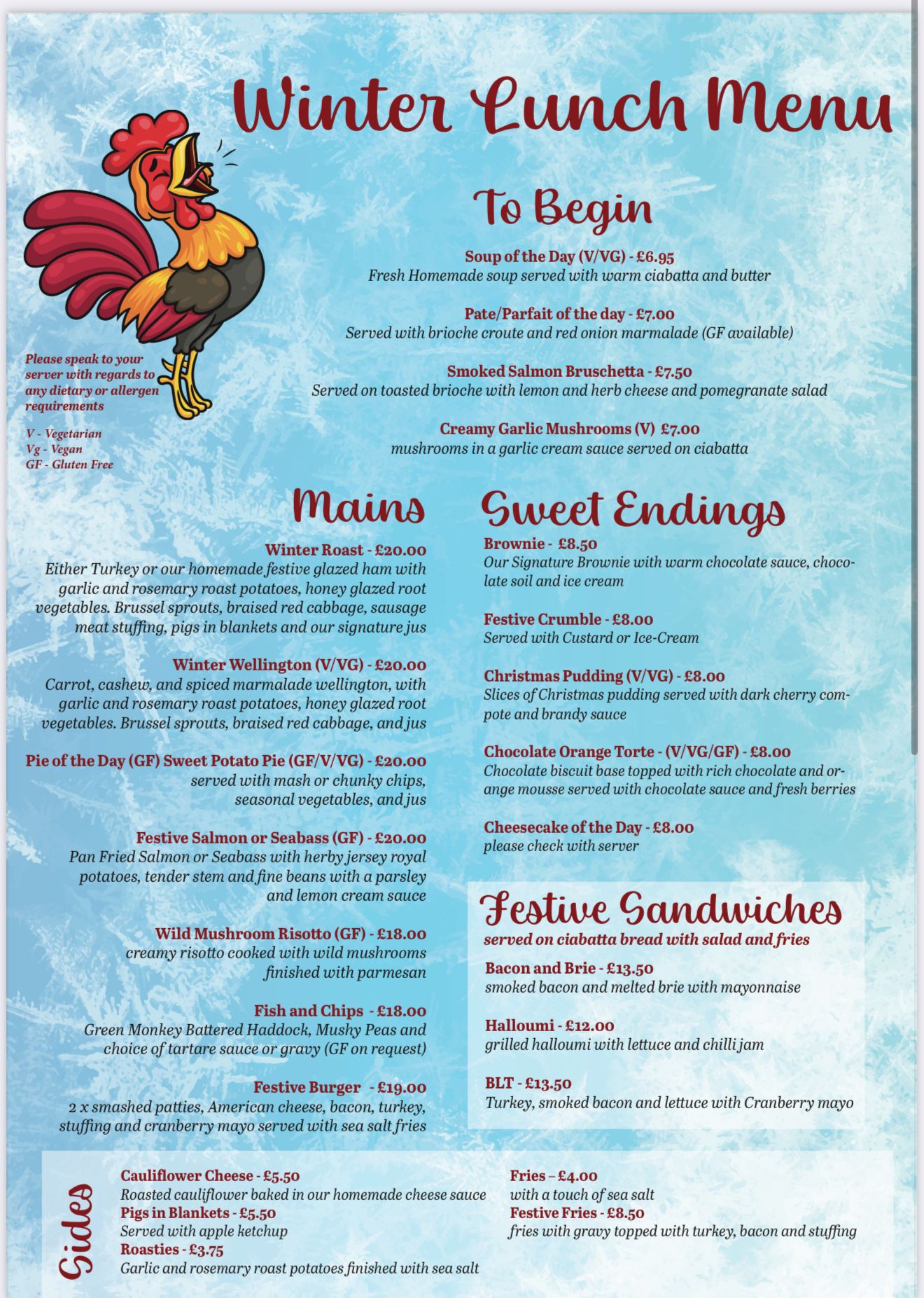 In addition to the menus below, we offer special menus made with fresh seasonal ingredients. We have a food themed night the last Thursday of each month, check our events page for further information.